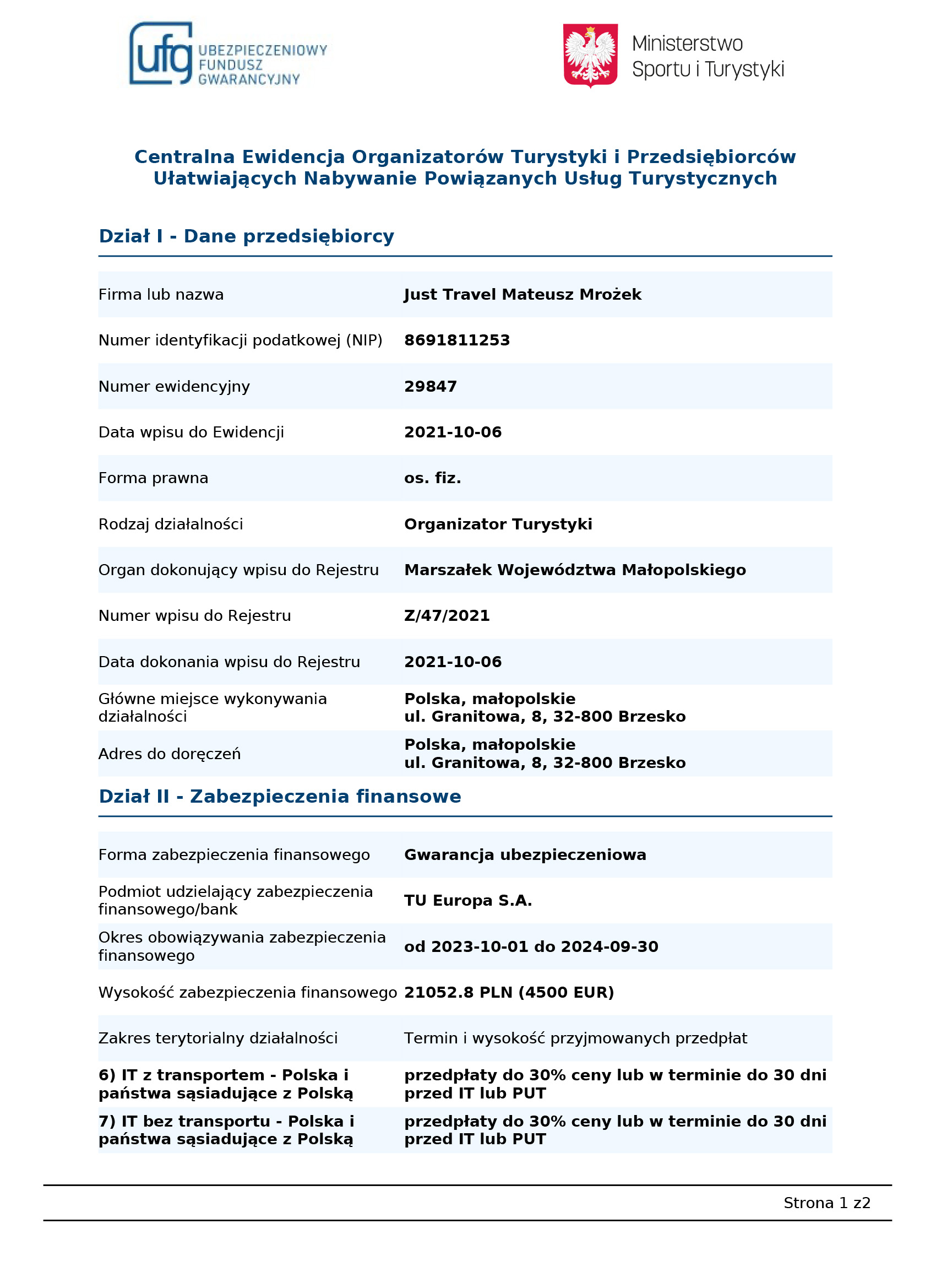 Prezentujemy Państwu wybrane dokumenty potwierdzajace nasze uprawnienia do prowadzenia biura turystycznego oraz uwierzytelniające naszą firmę.